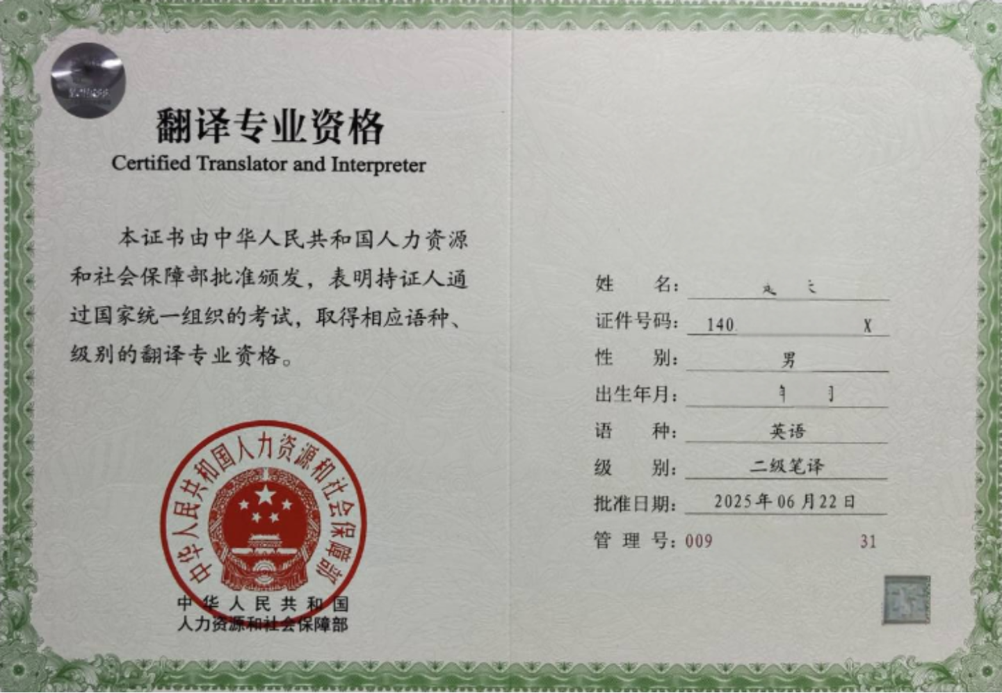 公司在翻译硕士英语笔译方向专业课程设置改革方面取得了显著成效,2024年新增设的《翻译技术》、《中国当代时文翻译》、《西方古代文明史》、《多模态翻译概论》和《CATTI二笔实务》等课程,在帮助员工通中国、晓世界、知传播、会技术,最终提升整体翻译能力上注入了强大动力。截止目前,2024级英语笔译专业共有8名同学(陈子烨、郭姝雅、胡文泽、卢秋瑾、秦佳伦、张涵宇、张露瑶、赵嘉禾)获得二级翻译资格证书(7名二笔,1名二口),取得了公司自开设翻译硕士专业学位培养以来的最好成绩。